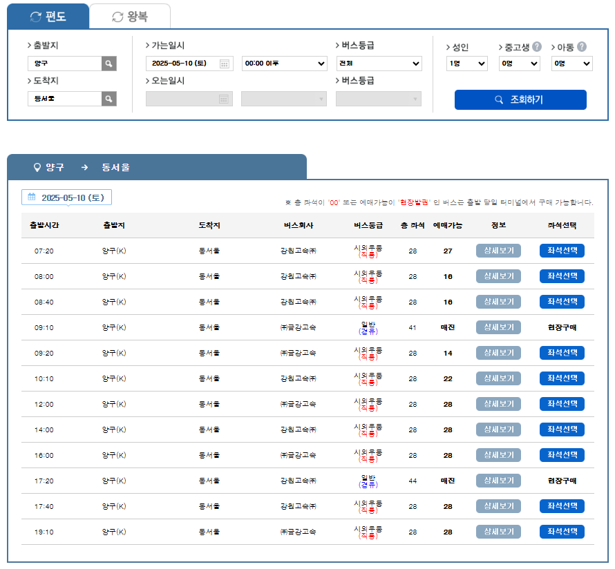 - 출발지: 양구, 도착지: 동서울 입력
