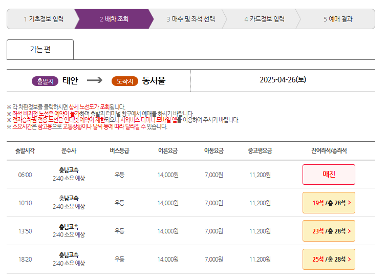 - 출발지에 ‘태안’, 도착지와 날짜 입력